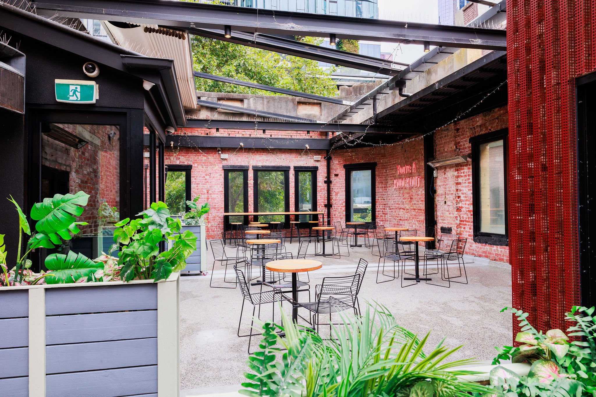 The outdoor rooftop at Retro offers a bright, open‑air space overlooking Lonsdale Street, available for exclusive private hire for groups of up to 80 guests.